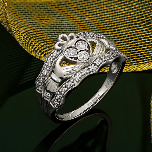 14k White Gold and Diamonds Claddagh Ring