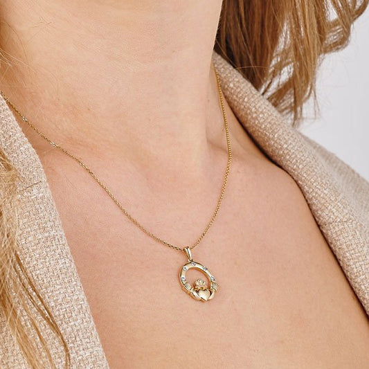 14k Gold & Flush Set Diamonds Claddagh Necklace